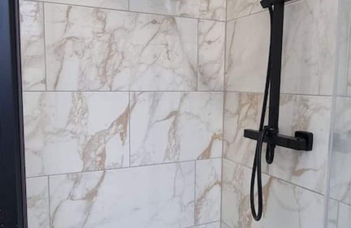 The modern bathroom offers a tranquil escape, boasting a refreshing shower and complimentary toiletries for your indulgence.