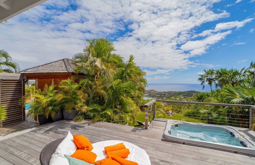 At the front, the large terrace welcomes guests around a heated jacuzzi facing the view, amidst the lush tropical vegetation. There are comfy sun loungers on the wooden deck, a great spot to relax under the Caribbean sky. On the side, you ll find a comfortable outdoor lounge consisting of a sofa and armchairs made of woven fibers covered with cushions for delightful moments to be enjoyed reading or resting in the mild breeze blowing through this haven of peace. In this idyllic scenery, your stay in Saint Barths looks like a romantic interlude out of time in the heart of a small paradise.
