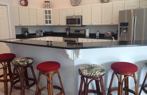 Upstairs, a large master bedroom contains a king size bed, 49 inch Smart TV, and a futon. The master en suite bath with corner soaking tub and separate shower also contains a convenient washer and dryer and walk-in closet. A balcony overlooking the pool can be accessed from this bedroom or from a hallway door.
