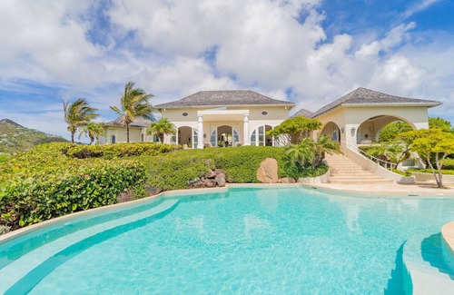 Built over several levels, the villa rental AMIS DU VENT is a beautiful property with arched windows and whitewashed walls which remind the Mediterranean style. The living room features elegant off-white tones, with sofas, armchairs and wooden furniture facing the windows that open both onto views over the ocean and the neighboring islands, and onto the lush garden at the back. The marble and stainless-steel kitchen with central island is located close to the dining area with a round table in a bright ambience. On the lower level, you ll love enjoying the TV room and the well-equipped gym in a very private atmosphere.