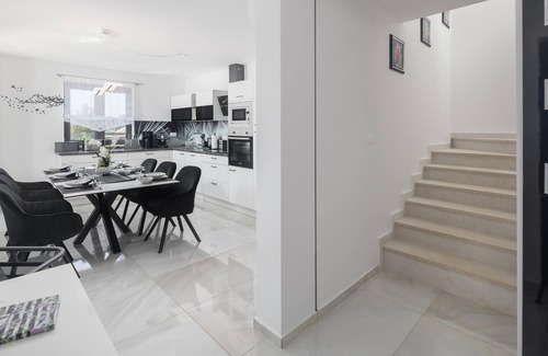 Look forward to this elegant and modern vacation home, which welcomes you with comfortable furnishings and a successful color concept of light and dark colors. You can relax here with your family and call the rooms on two floors your home. While on the upper floor you will find the spacious bedrooms, each with a private bathroom, on the first floor you can get together as a family, cook, eat and relax on the sofa.