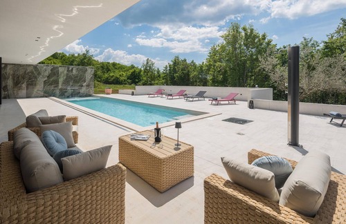 Experience an unforgettable holiday in the north of Istria in this beautiful and comfortable holiday home. On two spacious floors, selected and beautiful design meets high-quality furniture and promises you relaxation and entertainment. Enjoy the privacy of the large bedrooms with adjoining bathrooms or enjoy the company of your loved ones in the airy living room. Cook delicious meals in the modern kitchen and dine together overlooking the pool.