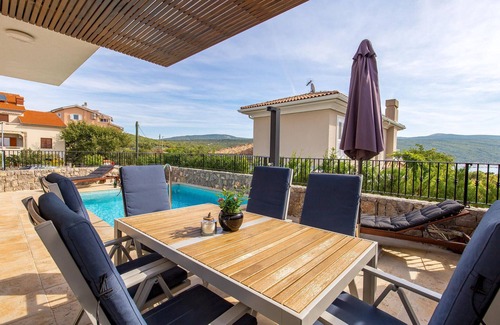 This wonderful holiday home with pool is located on the island of Krk in the small village of Korni. It is about a five-minute drive from the historic town of Krk and the town of Punat with its well-protected harbour. Due to its hilly location, the house offers a fantastic view of the sea and the olive groves for which the region is famous. The lovingly furnished house is built in typical island architecture and consists of a successful mix of modern and traditional elements. From the living room you have direct access to the terrace with barbecue, lounge and sunbathing area and heated pool. The master bedroom is on the ground floor and the other two are on the upper floor. The house is air-conditioned, has underfloor heating and there is also parking space on the large, fenced plot.
