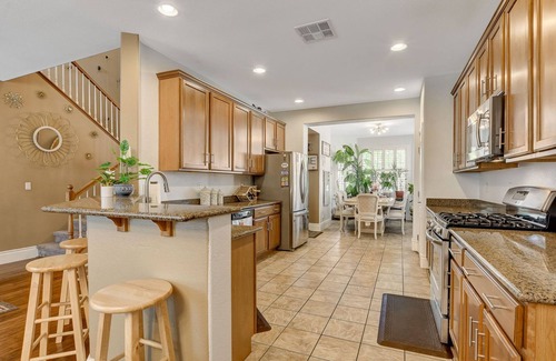 Master bedroom is on the first floor and has a king size bed. There are 4 more bedrooms upstairs. Bedroom #2 has a king size bed that shares a Jack & Jill bathroom with bedroom #3 that has a queen size sleigh bed. Bedroom #4 has a queen size bed. And bedroom #5 has a three-level bunk bed that sleeps three. All bedrooms have a Samsung flat screen TV. The entire house has the highest speed Wi-Fi powered by Verizon and boosted by a high-end Wi-Fi extender, accommodates 50 devices, and streams Netflix, HBO Max, Disney, Prime, Paramount, Hulu and Apple TV (included, no extra charge). Three-car driveway is reserved for your parking spaces (garage not available). Street parking is okay especially if you are pulling a trailer or have a big RV.