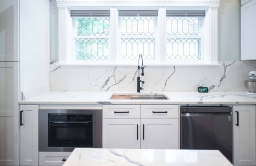 The interior of the home is as, if not more, impressive as the exterior, with gorgeous woodwork and antique detailing throughout. The bright and airy front sunroom is a wonderful place to enjoy a quiet book or your morning coffee while you watch the neighborhood come to life. Heading further indoors you’ll find a cozy living room with plush sofa seating, a mounted smart TV, and gas fireplace where you can light up the ambiance and create a warm setting for an immersive movie night during the cooler nights or months. Steps away, the formal dining room features an elegant table with enough seating for 6. Flow into the pristine kitchen, a chef’s dream with stainless steel appliances, marble countertops, and single serve coffee maker. A full suite of cookware and dining ware are ready to accommodate any of your mealtime adventures whether you decide to whip up delicious home cooked meals or present takeout from a delicious local restaurant.