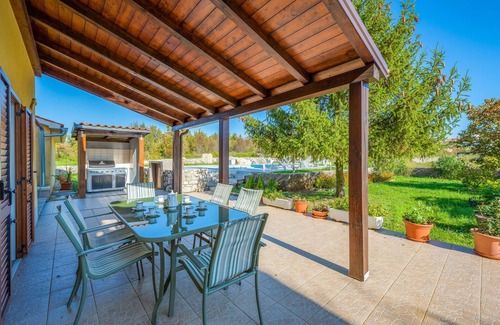 This beautiful holiday home is located about 15 minutes by car from the most beautiful beaches in Istria, which are located in Rabac. The garden is at the back of the building and has a lovely covered terrace where you can spend many pleasant hours outdoors. There are three bedrooms on the first floor, while another separate bedroom with its own bathroom and private entrance is on the ground floor. The interiors are furnished with simple, classic-style furniture. Visit the surrounding places, such as the old town of Labin and let yourself be enchanted by the small streets with their galleries. From here you can also easily reach the seaside resorts of Duga Uvala, Prtloga, Sveta Marina and Ravni. Take a day trip to the historic amphitheatre in Pula or to the Brijuni Islands.