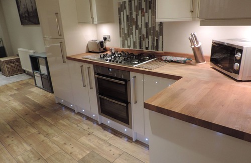 Kitchen includes a solid wood oak worktop. High gloss kitchen with double oven, 5 ring hob and extractor. Fridge/Freezer. Washer/Dryer, Double sink. Spotlights.