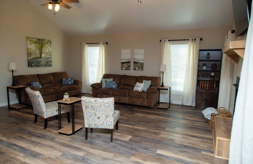 Our main floor features an open design floorplan including a large living area with gas fireplace, a fully stocked kitchen with bar top and four barstools. Also included is the dining area with seating for six. A leaf is available providing extra seating upon request. The main floor also has an office furnished with a full-size desk and chair and futon for additional sleeping space. The master bedroom has a king size bed, electric fireplace, and full bath featuring a large standalone soaking tub and