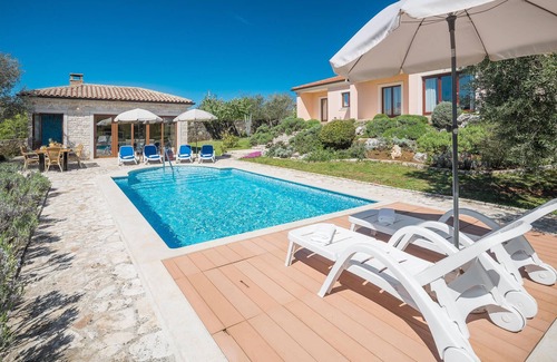 This beautiful vacation home with pool is located in green surroundings and surrounded by olive trees. It is spacious and comfortably furnished. Next to the pool is a tavern with kitchen, dining and living room. Near the house there is a restaurant where you can taste local specialties. On the many bike paths you can discover the famous wineries. In Savudrija, the westernmost point of Croatia, you can visit the famous lighthouse, built in 1826. It is considered the oldest and the northernmost lighthouse in Croatia. Visit the famous ATP tournament that takes place in Umag every July.