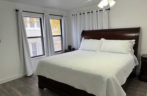 Completely updated 2 bedroom, 1 bath detached apartment from main home on property. The main home is a historic home built in 1917. The main home is the primary residence for the owners of the property. The apartment is a separate building with a separate entrance built in the mid 80's. We completely renovated the apartment in 2023, all the way to the subfloors and drywall. The apartment is on the SECOND FLOOR, accessible by stairs. It has a full living room and kitchen with a dishwasher, stove/oven, microwave and refrigerator with freezer. The couch is a queen size fold out couch. Large, 55" Smart TV with Roku. There is cookware, dining ware and utensils available to prepare your own meals. Both bedrooms have a king size bed and black out curtains. The property is one block off the main highway and within minutes of area restaurants and attractions.