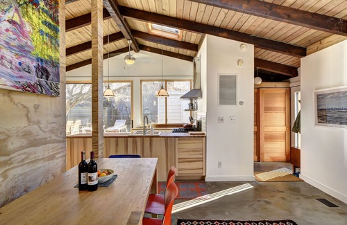 Crackling wood fireplace and a cedar sauna set you up warmly for the quiet elegant seasons on the East End, fall & winter. This one of kind Leisurama was re-imagined for its Brooklyn based artist and producer owners. Sexy black framed deck openings, birch ply interior mill work, and a cedar sauna hut and outdoor shower create atmosphere that feels elevated and removed. Surfers are stocked because Ditch Plains is only a 10 minute drive bypassing town. Guests may use the Robert August longboard or Channel Island Pod Mod, easy entry boards. 2 bedroom, 1 queen bed, 2 twin or 1 king, 1.5 bath, outdoor shower, living room sleeper, Aero-mattress, sleeps 6, wood fireplace, outdoor fire pit, grill.