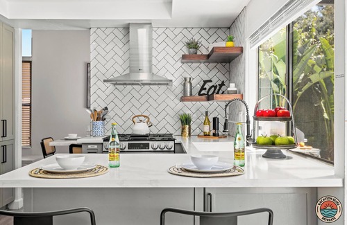 Ready to play? The game room is stocked with retro fun – classic Nintendo (yep, with 620+ games), two custom arcades, foosball, darts, and even a ping pong table. Whip up your favorites in the stylish kitchen – it’s got stainless steel appliances, a spacious layout, and bar seating for hangouts while cooking. Eat inside or take it outside to the breezy veranda for some SoCal-style dining.