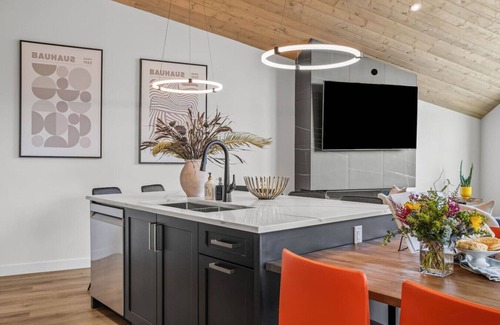 Our bright living area features striking geometric millwork and soaring sloped ceilings, creating a spacious and inviting environment ideal for relaxing after a day of exploration. Furnished for comfort, it offers spectacular mountain views, a cozy fireplace, and a large Samsung 70” flat-screen TV to enhance your entertainment experience.