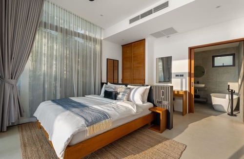 Experience luxury at our beachfront villa in Koh Samui. This oasis boasts a saltwater infinity pool with a shallow area and jacuzzi, framed by a semi-private sandy beach. Unwind in five sumptuous bedrooms, each with an en-suite and ocean views. Savor culinary delights in a state-of-the-art kitchen, and dine under the stars. Your rooftop awaits for intimate evenings. Each detail is crafted for your ultimate comfort. Our dedicated team of 3 full-time staff are there to anticipate your every need.