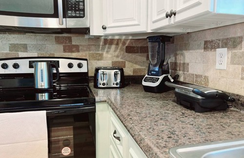 A chef’s dream with stainless steel appliances, a coffee maker, and everything you need for cooking. The open-concept dining area is perfect for family meals or game nights.