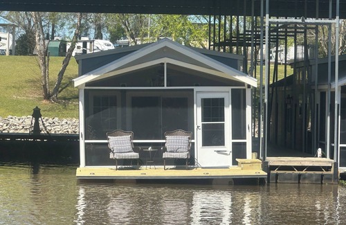 Enjoy a peaceful stay at this charming boathouse in Bainbridge, Georgia. This cozy two-bedroom retreat features one king bed and one twin bed, perfect for a small group of guests.