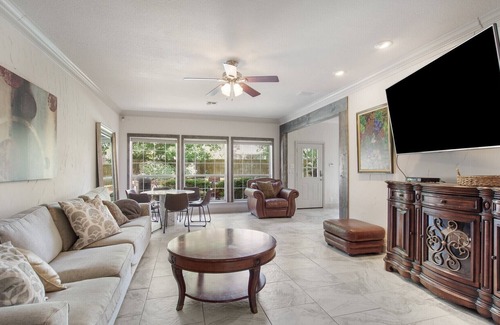 6 bedrooms, 4 baths 3000 sq feet plus gameroom and media room. Enter into wood floors through the family room with fireplace upgraded lighting, custom window treatments and decorator paint. Granite island kitchen; breakfast area with bay window. Oversized master with dual closets and jetted tub. Master with king sized bed, secondary bedroom down with dual queen beds and both upstairs bedrooms have 2 queen beds. Game room has 3 queen beds.
