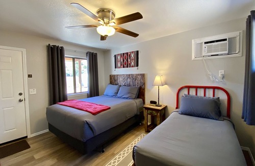 This newly remodeled one-room stucco casita with a kitchenette is surrounded by the Gila Wilderness. This is our smallest and most economical casita. This unit contains one room with one queen-size bed and one twin-size bed, a mini fridge, toaster oven (big enough to bake a 12in pizza), microwave, and a Keurig coffee maker. The cabin has a full-size bathroom. There is a shared patio with a gas fire pit, table and chairs, and a propane BBQ grill for your use. The casita is tastefully furnished with artwork depicting the local area.