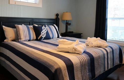 The 3-bedroom cottage is designed for comfort and space, featuring a king bed in the master suite, a king bed in the second bedroom, queen bed in the third bedroom, and a queen sleeper sofa in the living area—perfect for large families or groups. A fully equipped kitchen, private porch, in-suite laundry, and a spacious living and dining area make this a true home away from home.