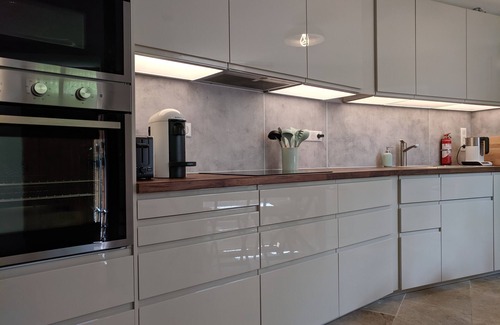 The well-furnished renovated cottage has an open kitchen-dining-living space that offers a modern contemporary kitchen with an extendable dining table, and a living area with a sofa and a smart connected TV with a DVD player. The kitchen is equipped with an induction hob, an integrated oven and microwave oven and a large dishwasher. For the coffee lovers, there’s a filter coffee maker. It also comes with a washing machine and a dryer. Wifi is free and is available throughout the house.