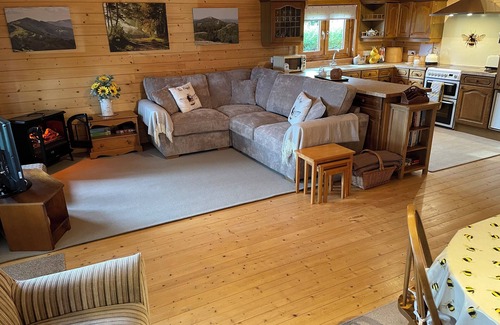 Open plan kitchen and living/dining area - fully equipped kitchen with cooker, microwave, fridge, freezer and dishwasher. Large sofa bed sleeping two more guests if required, TV, radio, night storage heater and ceiling fan. An electric smoke effect fire for cosy nights in. Dining table and chairs and separate seating area.