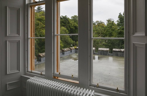 Located on the sweeping first floor of Lews Castle (accessible via lift and a few steps) our Shoeburn apartment offers an incredibly spacious open-plan living, kitchen and dining area, overlooking Stornoway harbour and the main entrance. Swathed in a chic and contemporary palette, the fully-equipped kitchen leads into a beautiful living area with corner sofa. The adjoining bedroom has a large, cosy bed and double wardrobe, but due to the unique layout of the castle, has views over the castle roof. The en-suite bathroom offers a powerful shower and 'his and hers' sinks.