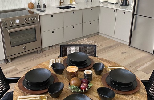 The kitchen has a slim refrigerator/freezer. There is a main sink and a prep sink along with a Bertazzoni electric range. Inside the cabinet drawers you will find Caraway pots and pans, silverware, cooking utensils, a selection of spices and other cooking necessities. On the counter there is a Smeg toaster and an espresso machine. We offer Keurig coffee as well as pour-over Chemex coffee with a kettle. There are a variety of teas as well. The kitchen has dining for 4 at the table.
