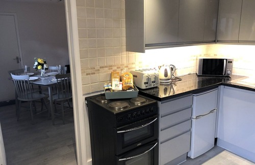 The kitchen is fully equipped with crockery, pans cutlery, fridge and small freezer, air fryer, kettle and toaster. This leads out into the gravel courtyard and round to the patio area that has stunning views over farmland.