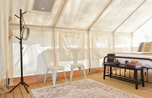 Inside the tent, you'll find cozy queen beds adorned with soft white linens, promising a restful night's sleep. We've taken care of the essentials, including a mini refrigerator, a Keurig coffee maker, and electrical outlets for your devices. Take up cooking by fire at the fire ring with a cooking grate, dine at the picnic table, or unwind in the hammocks.