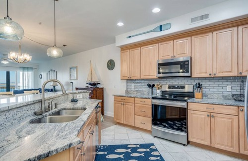 Just off the Living Area, step onto the beautifully furnished Balcony and gaze at the Chincoteague Bay. Whether dining or simply relaxing, you won't want to leave this amazing Outdoor Living Area. There is comfy furniture to curl up with a good book, and a Dining Set if you prefer to dine Al Fresco. Speaking of dining, the Chef in your Family will adore the well-equipped Kitchen with every gadget you could possibly imagine from a Crock Pot to a Waffle Maker! With Warm Wood Cabinetry & Custom Tile, preparing meals will feel like anything but a chore - and you can even take in Views while cooking. The huge Dining Table is perfect for family meals, or perhaps family game night!