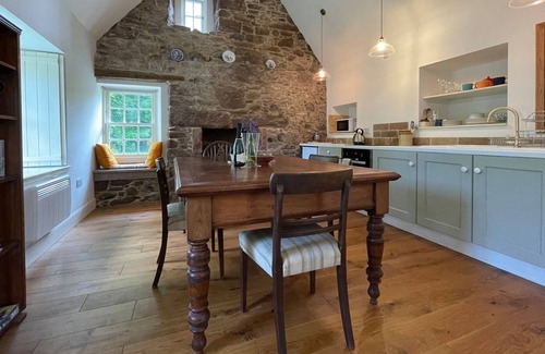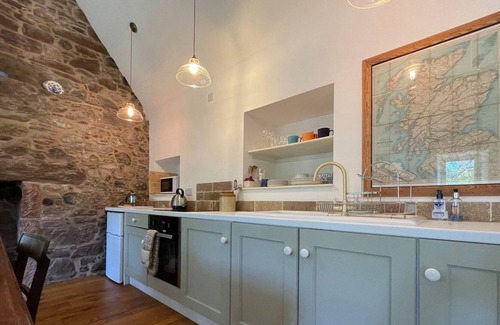 A truly outstanding Highland cottage in a delightful location. There’s not much more you can ask for in a traditional cottage for two.. Old Manse Cottage is a traditional Highland cottage that has been lovingly renovated to a very high standard to provide spacious, light and comfortable accommodation. Strolling through the green front door you enter the amazing open plan living space which is incredibly spacious and makes the most of original features. The space is triple aspect so there is a lot of natural light, including an outstanding window on the gable end of the building with a comfy window seat, inviting you to pass the time simply gazing out at the giant beech trees with a glass of your favourite drink in hand. The kitchen is a very generous size for a couple, and has everything you’ll want for a week-long holiday or short break in the winter. The dining table is an antique naval mapping table; lovely for cooking up a storm of multiple dishes and spreading out. The table is very well suited to those who may need to break out the laptop and do a bit of work. The living room space is centred around the wood burner, historic 18th-century stone fireplace, a comfy sofa and fireside chair, and a TV.