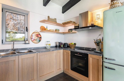 Inside: accommodation at Adriana is spread over two levels. The main entrance takes one into the open-plan living and dining area. Here, a beamed ceiling gives way to stone walls and then a triptych of large sliding glass doors, that both brings in the views and allows seamless access to the outdoor living and dining area and the pool. To one side are a pair of sofas and an ornamental fireplace, while to the other is a dining table and a small but well-equipped corner kitchen.