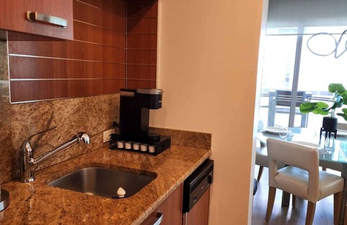 Enjoy breathtaking views of Downtown Miami and Biscayne Bay from our elegant one-bedroom apartment. Unwind in a modern bathroom with a deep soaking tub, separate shower, and luxury toiletries.