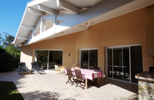 Welcome to Angresse, a small village on the Landes coast just 7 km from the famous spots of Hossegor, and 5 km from the golf courses. We welcome you in this beautiful and large villa of contemporary architecture of 256m² for a comfortable stay with family or friends all year round. You will appreciate the calm and rest in this residential area with all the water sports, sports and summer activities nearby. Spacious and bright, this holiday rental is laid out on one level and offers a 60m² living room with flat screen TV, DVD player, a fully equipped kitchen (dishwasher, 4 cooking rings, electric oven, fridge with freezer), 3 bedrooms (2 king size beds 180x200, 1 bed 140), a relaxation lounge, 2 shower rooms, 3 toilets, one of which is independent, a laundry room (washing machine, dryer), wifi, a utility room , a private garage. A closed private garden of 1300m² is available as well as a beautiful covered terrace facing south of 30m² with garden furniture, deckchairs and plancha. We have baby equipment. Out of season, we have the possibility of offering you this rental for 4 people (by closing part of the house comprising 1 bedroom with 1 bed 180, the lounge area, a shower room with wc): in this case, a reduction of 100€ per week will be offered to you.