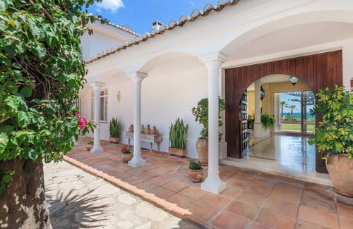 Nestled within the prestigious Guadalmina Baja urbanization, directly on the beachfront, "La Sirena" is a magnificent villa that harmoniously blends classic Andalusian architecture with modern luxury. This expansive property spans an impressive 8,952 m² plot, featuring a sprawling garden of approximately 4,000 m² with direct beach access.