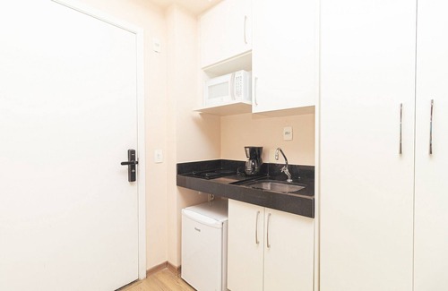 Complete accommodation for your stay, the space is modern, well used and decorated in gray and white colors with black marble sinks for you to stay in comfort and elegance on Turiassú street next to Allianz Parque, with minibar, induction stove, microwave , kitchen utensils, air conditioning, queen-size bed, wi-fi and television.