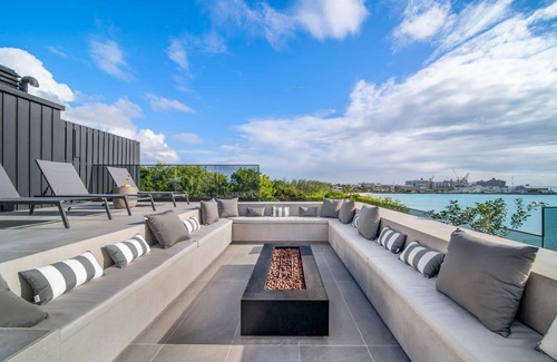 Step into the open-plan living area, where sleek, contemporary furnishings complement panoramic sea views. The space is designed for comfort and style, featuring bespoke decor and smart home technology to enhance your living experience. The kitchen has premium appliances and a breakfast bar, offering everything you need to prepare island-inspired meals. A convenient powder room is also available near the entrance for added comfort.