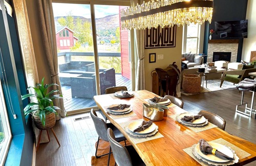 Come together for fireside movies in the exquisite Great Room, complete with oversize windows and elegant modern furnishings. Whip up meals in the chef’s kitchen and dine alfresco on the deck with outdoor furnishings or soak in your private hot tub as you look out towards the mountains off the bottom patio
