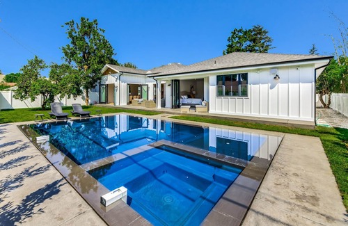Stunning single-story modern 3,870 sqft Amazing house in quiet Sherman Oaks neighborhood. 12 ft wood-beamed ceilings, wide plank French Oak floors and custom built-ins. Gourmet Chef’s kitchen with stone counters, Thermador appliances. The exquisite master features access to the backyard, large walk-in closet, and spa-like master bath with soaking tub, glass shower, and dual vanity. The spacious yard has a sparkling zero edge salt system pool complete with a spa and abundant entertaining space!