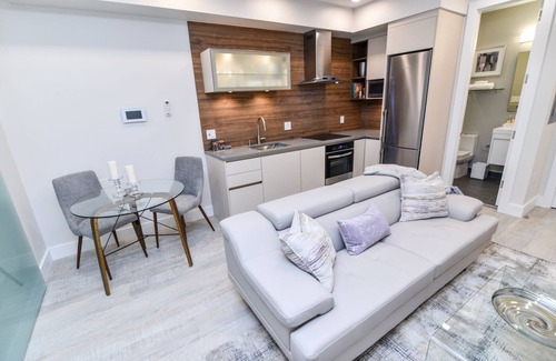 The custom kitchen and dining/living areas feature 9+ foot ceilings, 7" wide plank engineered hardwood flooring, stainless steel appliances and quartz Cambria counter tops in the kitchen. Breakfast/Dining area has a beautiful design tulip table that sits up to 3 people. There is a spacious bathroom with a roomy walk in shower. The bedroom easily hosts a queen-sized bed.