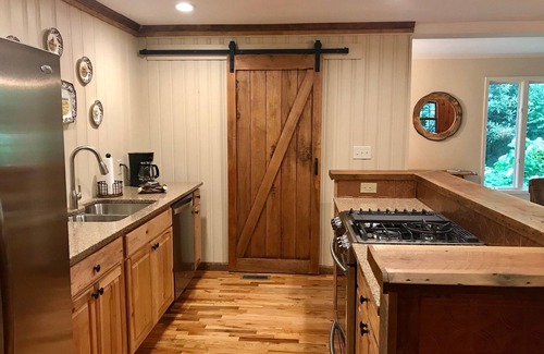 Gather around our beautiful handmade wood dining table in the river room for meals and game nights! Or enjoy time together on the creek side deck with picnic table and rocking chairs. The laundry room with new washer and dryer is also on the main level so you can pack light and go home with clean clothes!