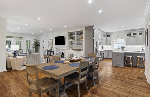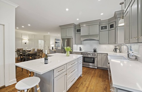 The home's impressive open design is complemented by a coastal-inspired crisp color scheme and large windows that usher in an abundance of natural light throughout the main level. The newly renovated kitchen features upgraded appliances & cabinetry and a large custom island with counter-stool seating, sure to be the ideal spot for entertaining. Hosting family and friends is a breeze. There is a breakfast area with seating for 6 as well as a large dining area table with seating for 8.