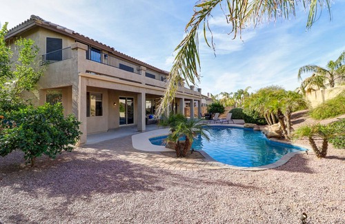 We welcome you to our residence Bronco Mar! Newly furnished with updated heated PRIVATE pool! Visit this 5 bedroom 3.5 bath home with 4600sqft providing room for the entire family! Modern style with an added rustic, desert twist! Experience the best of Arizona centrally located near baseball stadiums, shopping, and more! First floor MASTER BEDROOM has a king-size bed, attached full bath with his and hers robes and double vanity...plus access to the outdoor patio! The upstairs includes 4 guest bedrooms each with a TV (3) with Queen-size beds and (1) with two Twin-size beds and 2 full bathrooms. A recreational loft with POOL TABLE, TV, board games, PS3, and movies. Spacious kitchen fully stocked with Keurig coffee machine, utensils, dinnerware, glasses, pots/pans includes stainless steel appliances, 3 stools, table for 4, coffee maker, kid-friendly BPA free plates/bowls, and much more! Dining room and extra seating area off from the living room. OUTDOOR POOL heated with plenty of seating, outdoor grill, Pack-N-Play, and pool toys including baby float! Outdoor dining table seats 6. Pool lounge chairs provided (4).