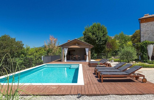 The perfect place to relax in the midst of soothing nature - Villa Veselici in eastern Istria. The villa is an old, beautifully restored stone house that exudes the charm of a traditional home yet offers the comfort of a modern vacation home. The villa is set on a 11500 m2 plot of land, allowing you to enjoy complete privacy. With the comfort of a private pool, this villa offers exactly what you need to escape the stresses of everyday life. The open plan first floor consists of a cozy living room and a fully equipped kitchen with dining area. There are a total of 3 bedrooms located on the upper floor. They each have a comfortable double bed, air conditioning, TV and an en-suite bathroom. The third bedroom also has a sofa bed for extra sleeping space. This room also has access to the lovely terrace from where you can enjoy the magnificent views.