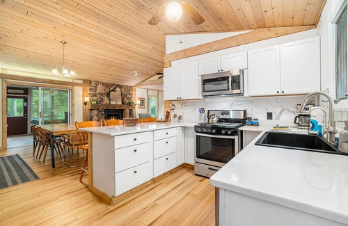 Featuring sun-soaked, spacious living areas, rustic cabin charm, and ample amenities, you’ll feel right at home in this tranquil hideaway. The bedrooms and multiple lounge areas are outfitted with comfy linens and plush seating, ideal for any family movie night or board game extravaganza. Don’t forget to stoke the fireplace for added ambiance! A well-appointed kitchen boasts modern appliances, gleaming countertops, and plenty of storage sure to make any home chef smile. Take pleasure in crafting effortless delicious meals after a day of hiking and swimming. As the sun starts to set, indulge in a glass of wine on the porch, listening to the soothing river nearby. Even better, gather around the firepit for s’mores under the stars, sharing laughs and making memories.