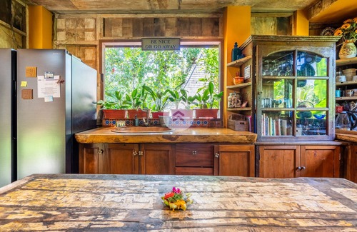 A stunning antique style home perched above Bali's Petanu River and just minutes from central Ubud. In Robinson Caruso fashion, the structure floats atop a jungle setting, affording views of a rare variety of native flora, fauna and rare indigenous trees. A nature sanctuary, the villa gains its inspiration from the traditional Javanese joglo architecture, incorporating natural tree trunk pillars and luxurious solid wood floors. The Master Bedroom stands apart from the two-storey open-air main house, as does the companion rustic French style kitchen. Moving down the embankment and toward the river, the property boasts a magnificent free-form pool complete with waterfalls, reflection pools, and an absolutely unique cliff-side dwelling in the form of a rustic cottage - the perfect get-away... Best of all, our home features a team of people who will tantalize your taste buds with epicurean delights from around the world. Our "house best" is our Indonesian meal!
