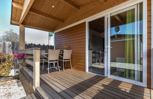 The holiday apartment boasts a private covered terrace. The property also has access to a shared outdoor area which includes a pool, a garden, a barbecue, a playground and an outdoor shower.