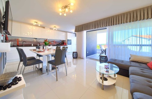 A few minutes walk from the beach Rova in Malinska, on the first floor of a modern building is a comfortable apartment Crystal Aura with a beautiful panoramic sea view. The accommodation unit offers a fully equipped kitchen with a living room, two bedrooms, one bathroom, and an additional toilet. A dishwasher and an oven are also available, as well as a kettle and coffee machine. Accommodation includes free parking in a private car park. The apartment is modernly furnished and air-conditioned. In the bathroom there is a washing machine and bathroom accessories. From the living room there is an exit to a large balcony which in the warm summer evenings serves as an oasis for relaxation and real rest after an active day. Bicycle and hiking trails are nearby. The center of Malinska is 2 km away. This accommodation is not suitable for pets.