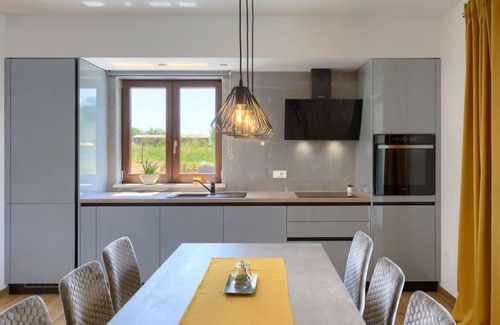 2-family house "Eroa", built in 2022. In the hamlet Orbanići Gorenji 2 km from the centre of Žminj, in a quiet, sunny position, 25 km from the sea, in a cul-de-sac. Private: property 500 m2, swimming pool angular (32 m2, depth 150 cm, seasonal availability: 01.May. - 30.Sep.) with internal staircase. Paddling pool, outdoor shower, barbecue. In the house: internet access. Parking at the house on the premises. Shop 2 km, restaurant 3 km, bus stop 3.2 km, pebble beach 25 km. Walking paths from the house 100 m, cycle lane 150 m.