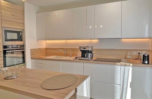 - Open plan kitchen equipped with 3 ring induction hob, fridge/freezer, oven, microwave, dishwasher, filter/expresso/cappuccino/frothy milk/hot water etc